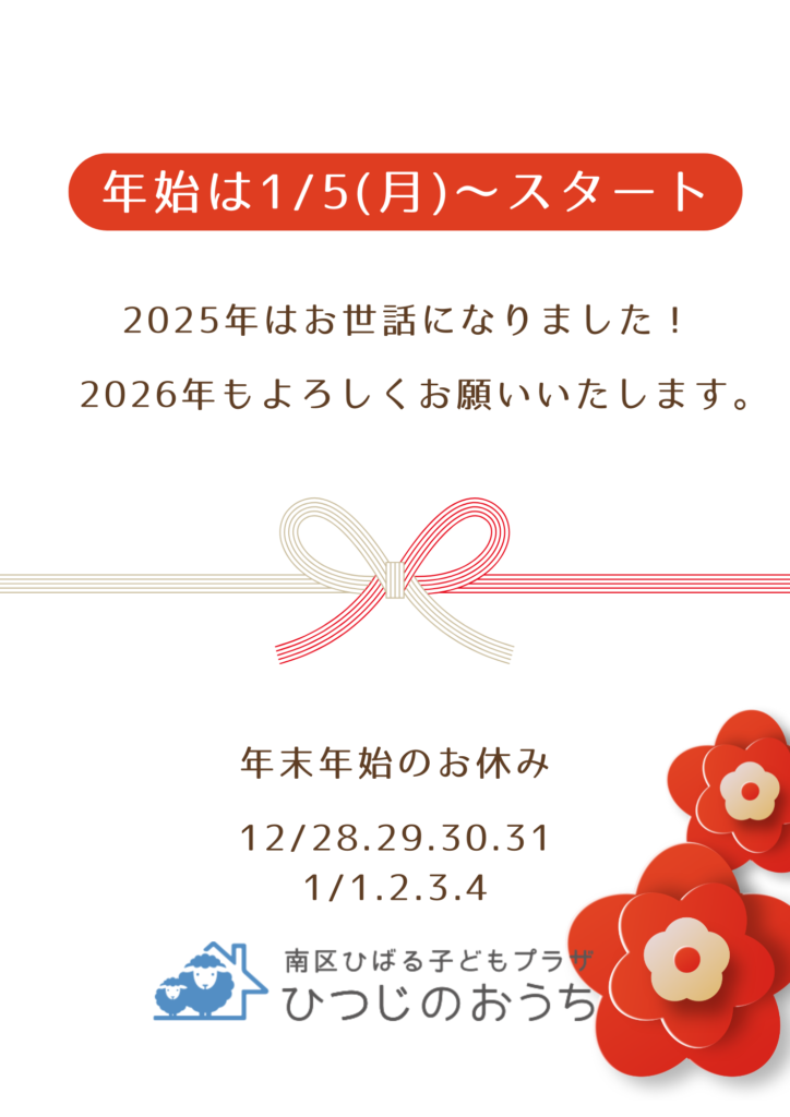ホームニュースお知らせ年末年始の休館日のお知らせ お知らせNEWS 2025.12.27お知らせ年末年始の休館日のお知らせ 今年もひつじのおうちにたくさん遊びに来ていただき、ありがとうございました☺️ 明日12月28(日)〜1月4日(日)まで休館となります。 新年、またたくさんのお友だちに会えるのを楽しみにしています🤗 よいお年をお迎えください✨